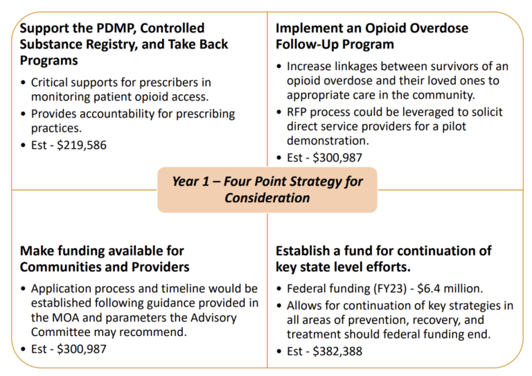 The plan establishes a fund for communities and providers to apply for grants; establishes a fund for continued state efforts in prevention, recovery and treatment; supports the state prescription drug monitoring program to ensure opioids are not being over-prescribed; and creates an opioid overdose follow-up program.